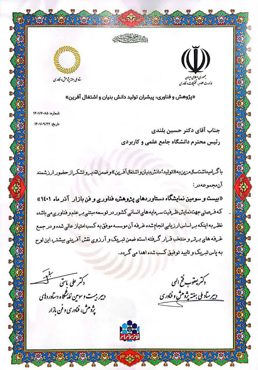 با گرامیداشت سال مزین به « تولید؛ دانشبنیان، اشتغالآفرین» و ضمن تقدیر و تشکر از حضور ارزشمند آن مجموعه در بیست و سومین نمایشگاه دستاوردهای پژوهش و فناوری و فن بازار آذرماه 1401 که فرصتی جهت نمایش ظرفیت سرمایه¬های انسانی کشور در توسعه مبنی بر علم و فناوری میباشد، نظر به اینکه براساس ارزیابیهای انجام شده غرفه آن مؤسسه موفق به کسب امتیاز عالی شده و در جمع غرفههای برتر و منتخب قرار گرفته است ضمن تبریک و آرزوی نقشآفرینی بیشتر، این لوح به پاس تبریک و تأیید توفیق کسب شده اهدا میگردد.